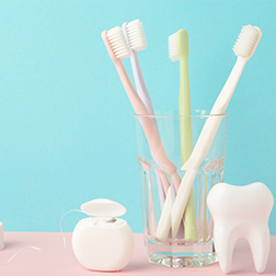 - Dental floss or floss picks for cleaning between teeth and around implants or restorations